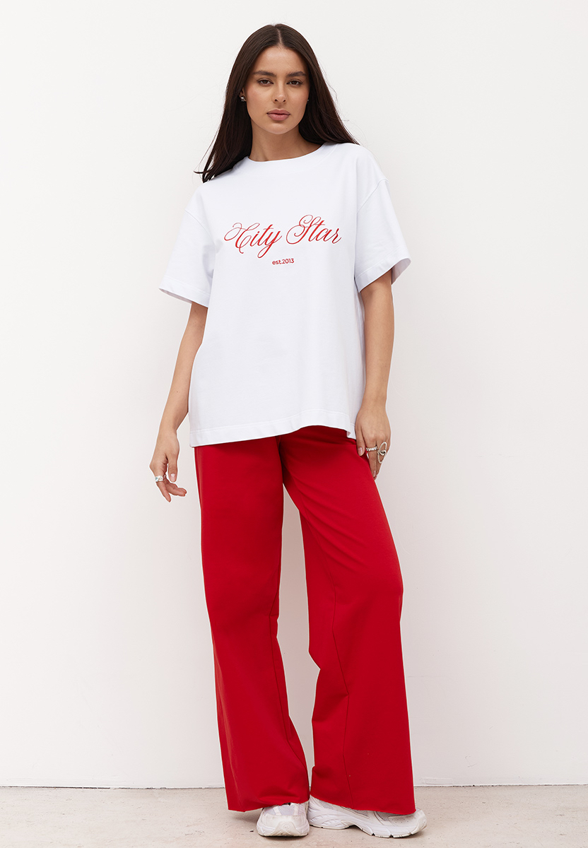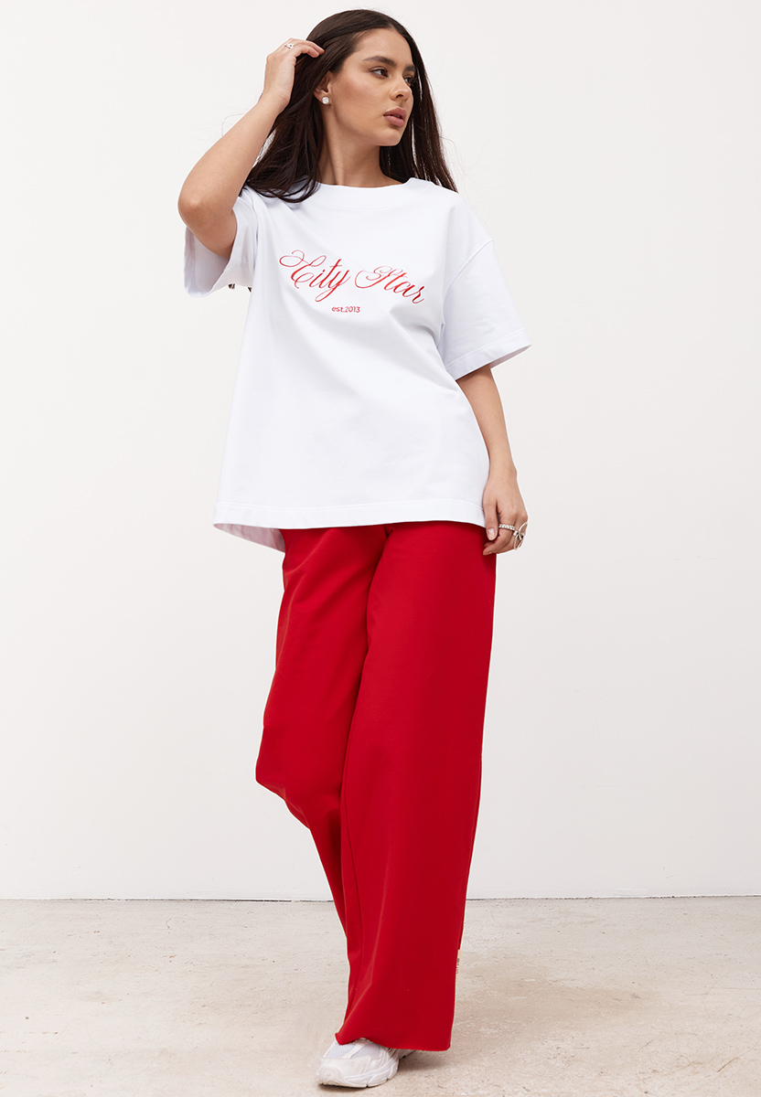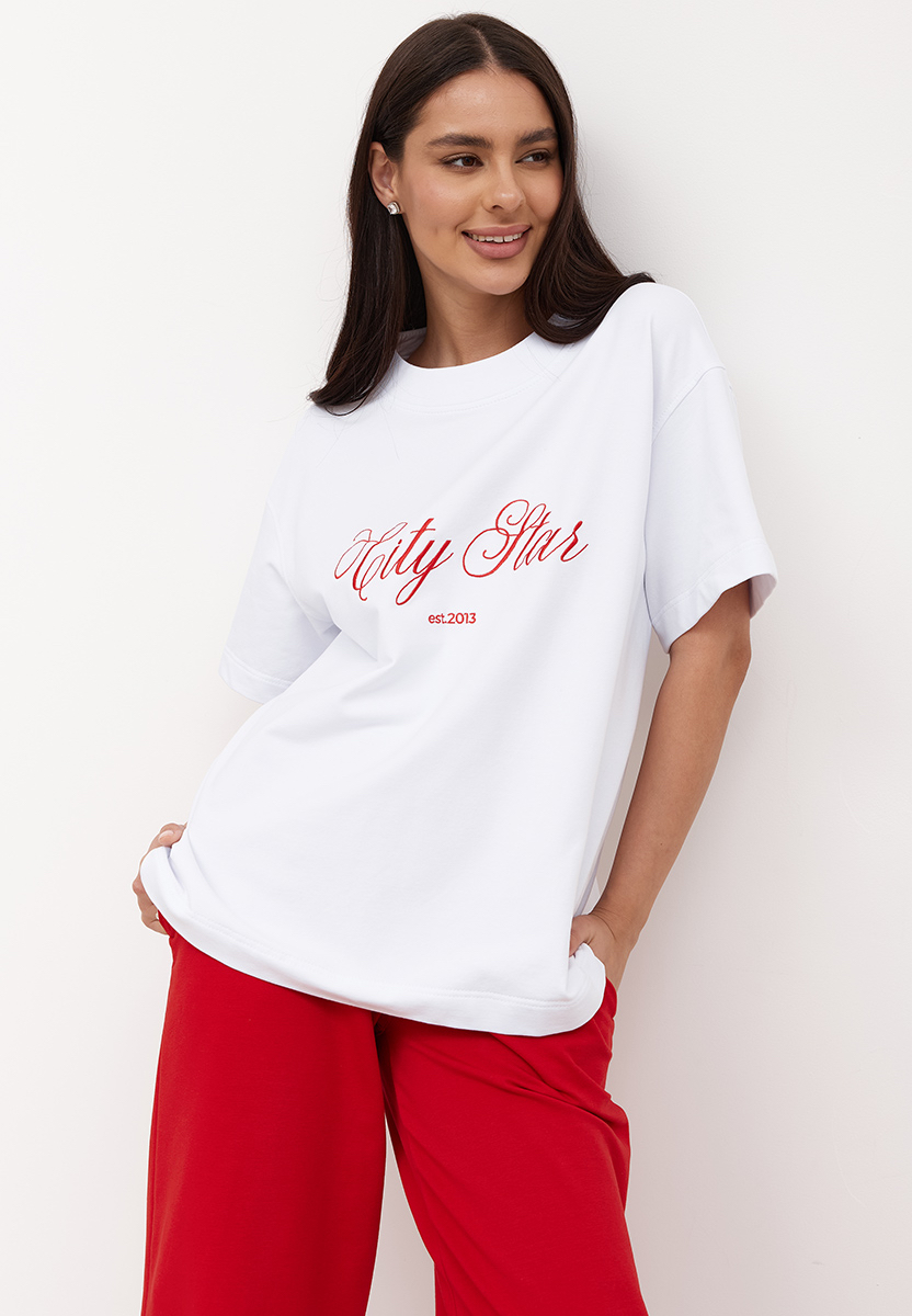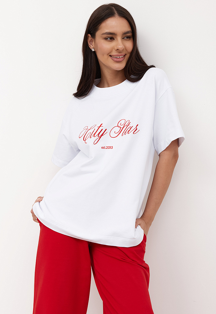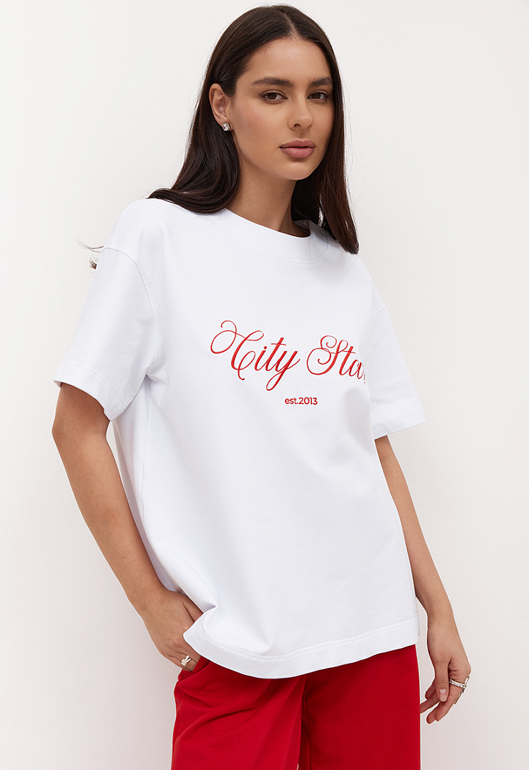 Детали: футболка из плотного трикотажа. Слегка спущенное плечо, по горловине обтачка, по переду вышивка в области груди.