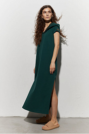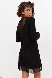 Детали: платье мини свободного кроя, расширенное к низу, без застежки, отрезное под грудью. Рукав цельнокроенный с отворотом по низу. Вырез горловины V-образный на запах по переду. В верхней части переда и спинки вертикальные рельефы. По рельефам и горловине отделочная строчка. Низ изделия в подгибку с отстрочкой.