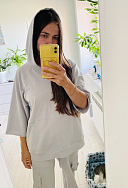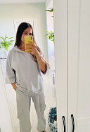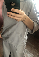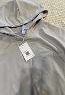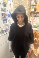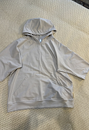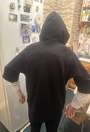 Толстовка из тонкой двухнитки, тактильно приятная, низ рукава не обработан, в носке и после стирок скатался валиком, кому критично что бы было ровно, читала что можно брызгать крахмалом(спец спрей). Лично мне не нравится что рекомендуемый режим глажки не способен разгладить идеально, по крайней мере у меня не получается, ну и что капюшон оттягиаает максимально горловину назад. А так хорошая, на лето и тёплую осень подходит. В сочетании с брюками этой же серии смотрится скучновато, лучше добавлять слой с контрастным цветом. С джинсовой неплохо смотрится. Брала на он 92,от 102 размер S, лучше бы взяла М)
