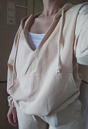 Очень классное худи, ношу со штанами, получился шикарный костюм! Удобный капюшон, вырез смотрится супер, необычно.